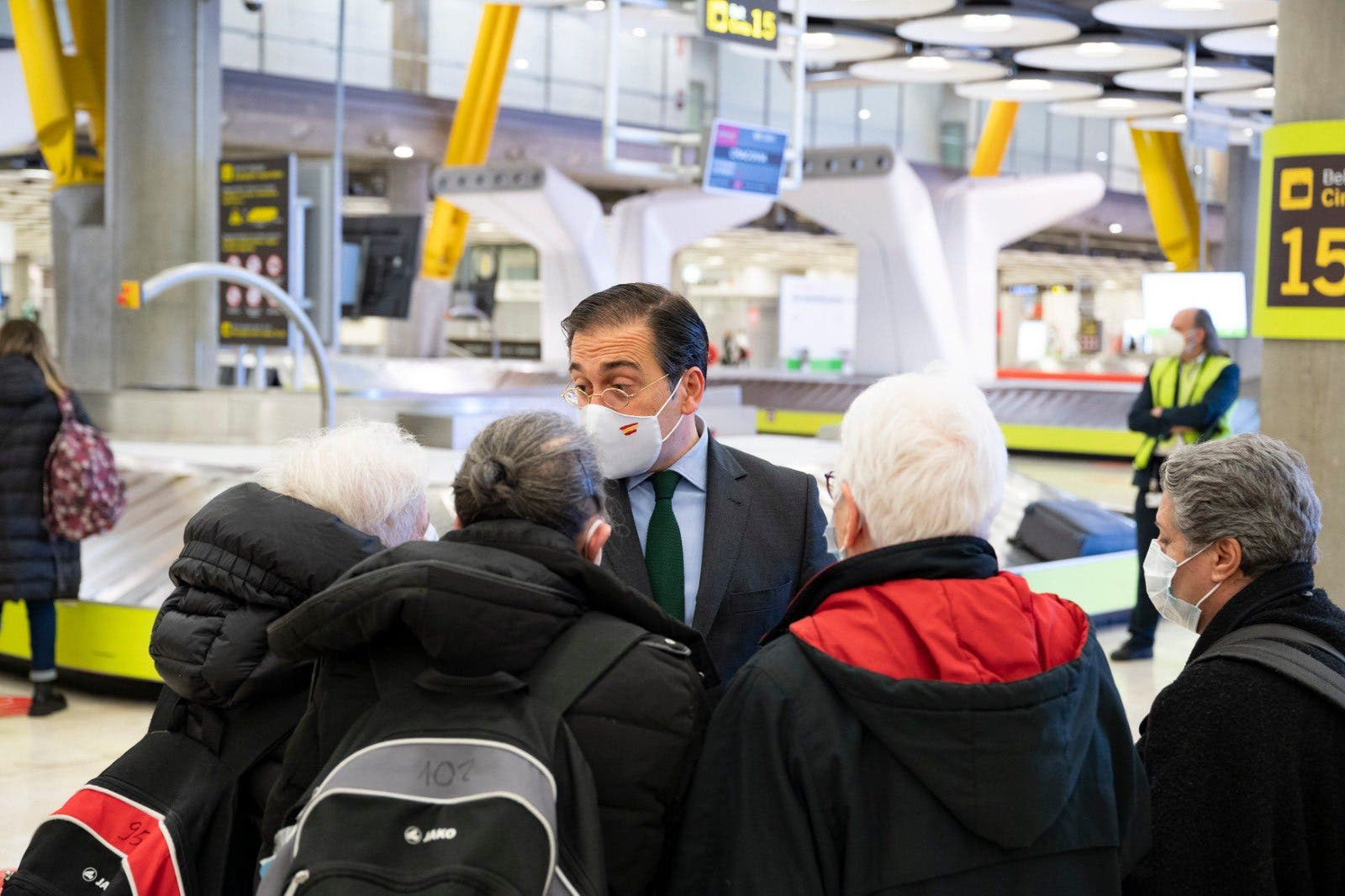 «He recibido en el aeropuerto a los 106 españoles evacuados por avión desde Cracovia. Alivio por su regreso, preocupación por Ucrania. España adoptará todas las medidas en su mano para detener la guerra y continuará enviando ayuda humanitaria y militar», ha publicado el ministro Albares en su cuenta de Twitter donde ha compartido imágenes de la llegada de los españoles.