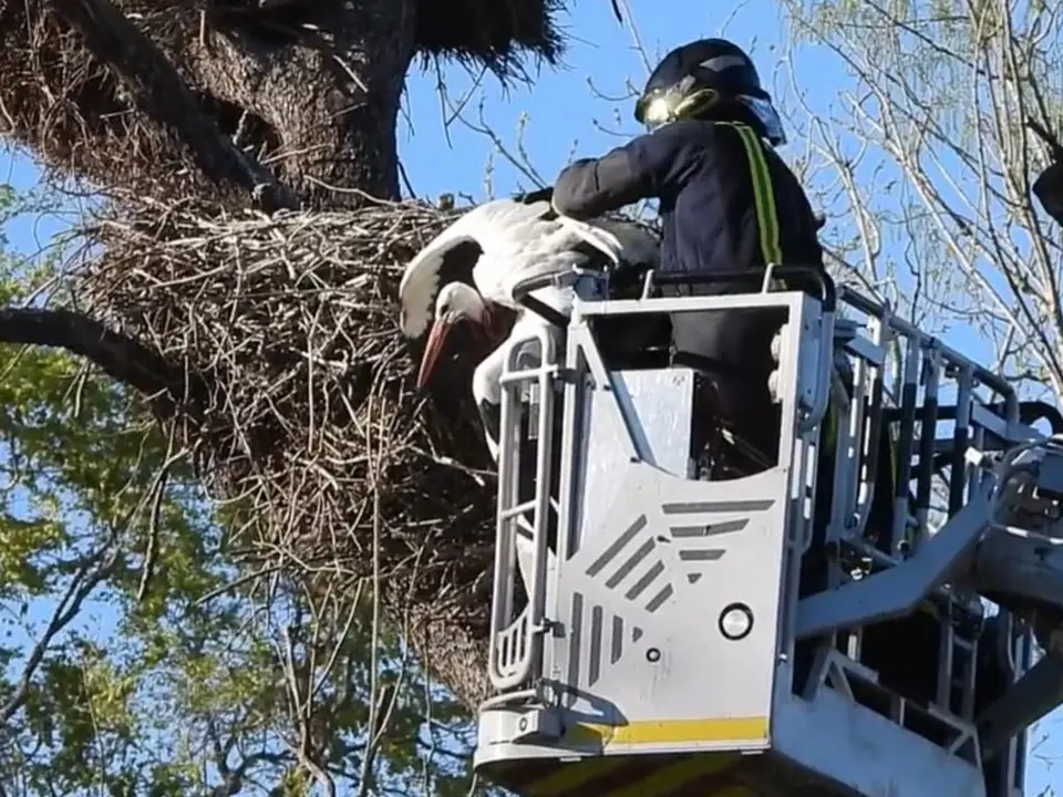 Los Bomberos rescatan a una cigüeña que quedó atrapada en un nido del Zoo de Madrid