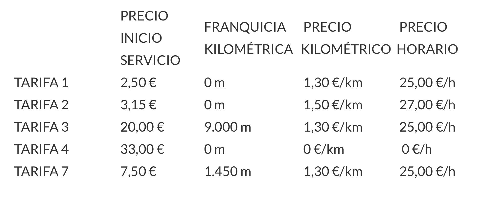 Por su parte, la tarifa 1 pasa de 23,75 a 25 euros/hora, lo que supone un incremento de 1,25 euros/hora con respecto a la tarifa vigente, mientras que la tarifa 2 (nocturna y de fin de semana) permanece sin cambios.