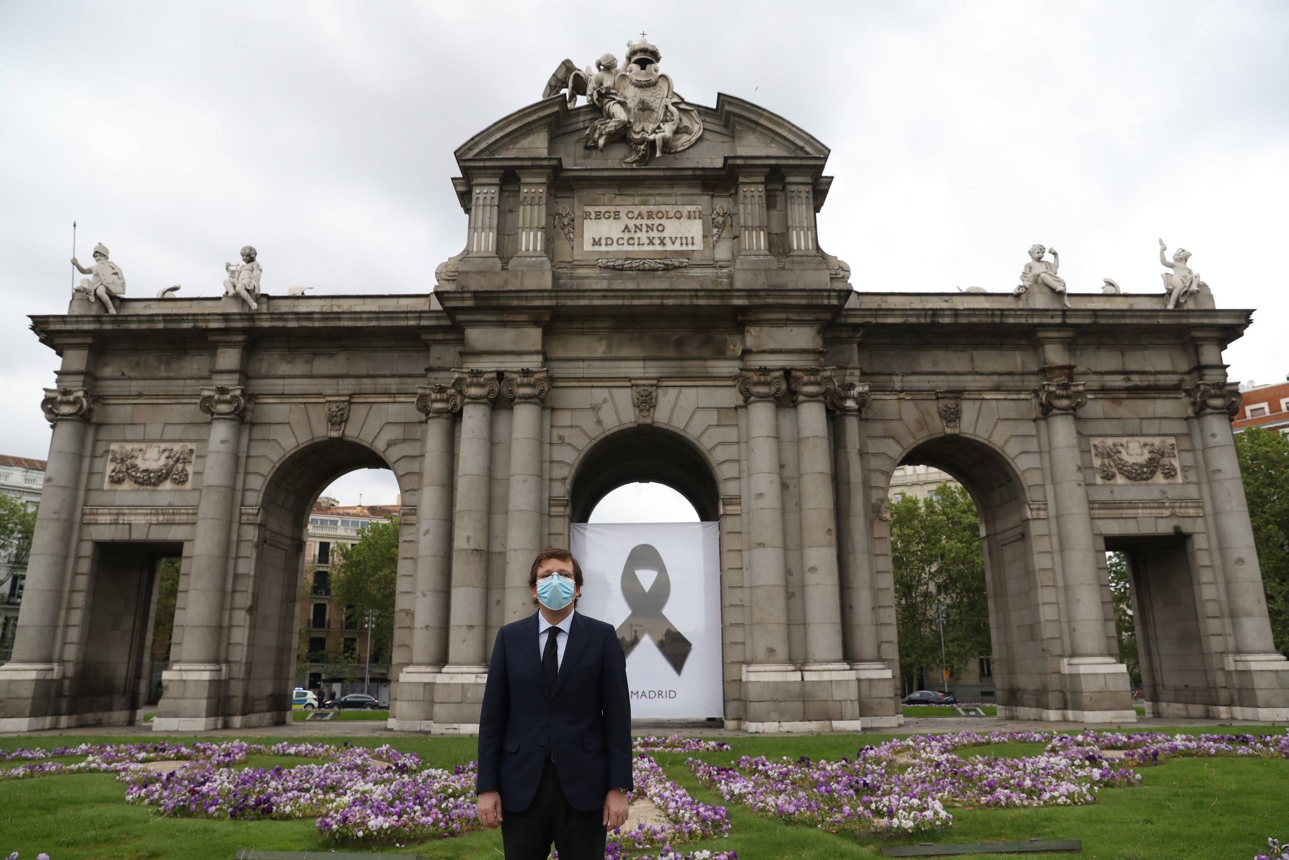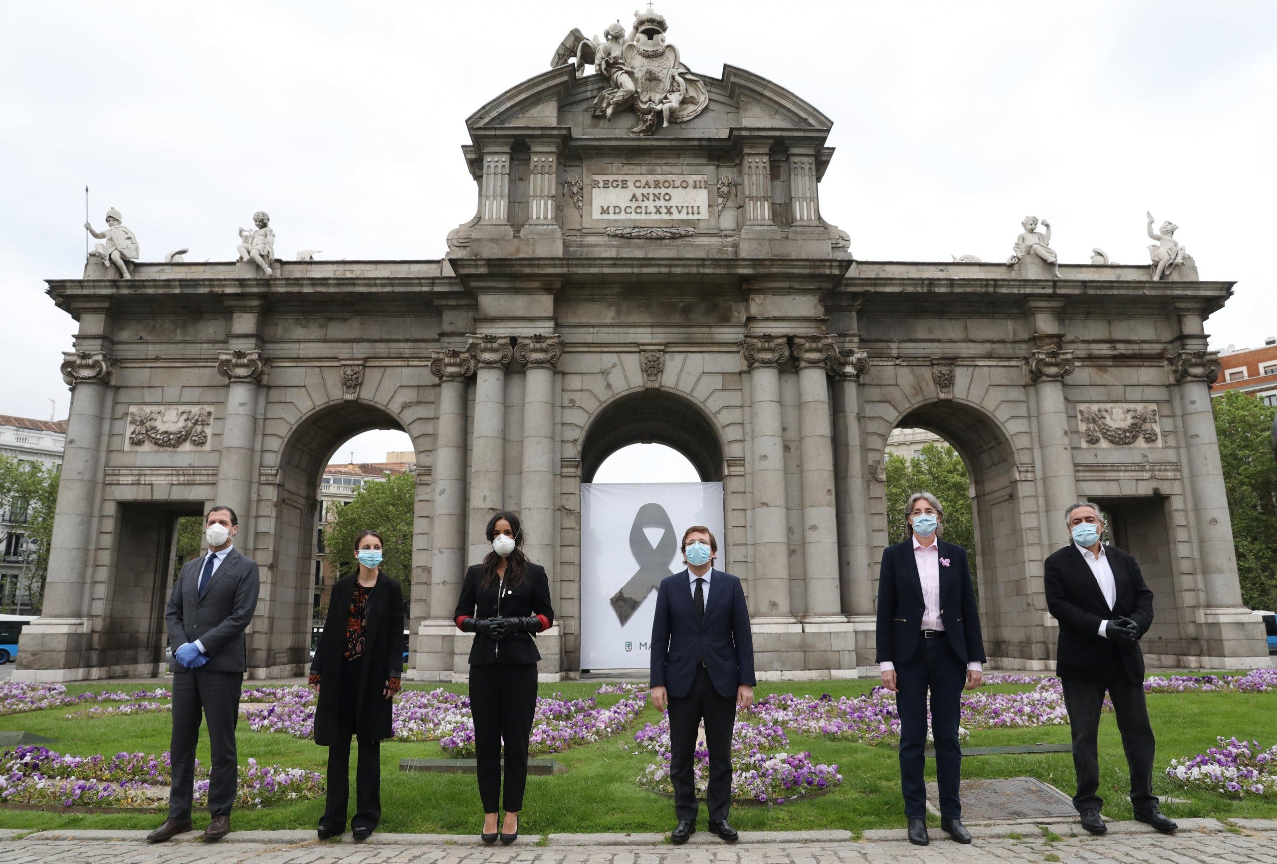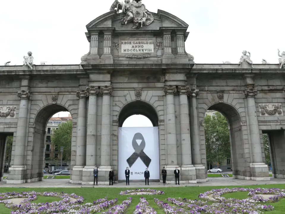 Este jueves, el alcalde de Madrid, José Luis Martínez-Almeida, acompañado de la vicealcaldesa, Begoña Villacís, y de los portavoces de los grupos municipales, ha guardado un minuto de silencio en la Puerta de Alcalá por los fallecidos a causa del coronavirus. En el acto se ha descubierto un crespón negro que el Ayuntamiento ha instalado en el monumento como homenaje a todas las víctimas de la pandemia.