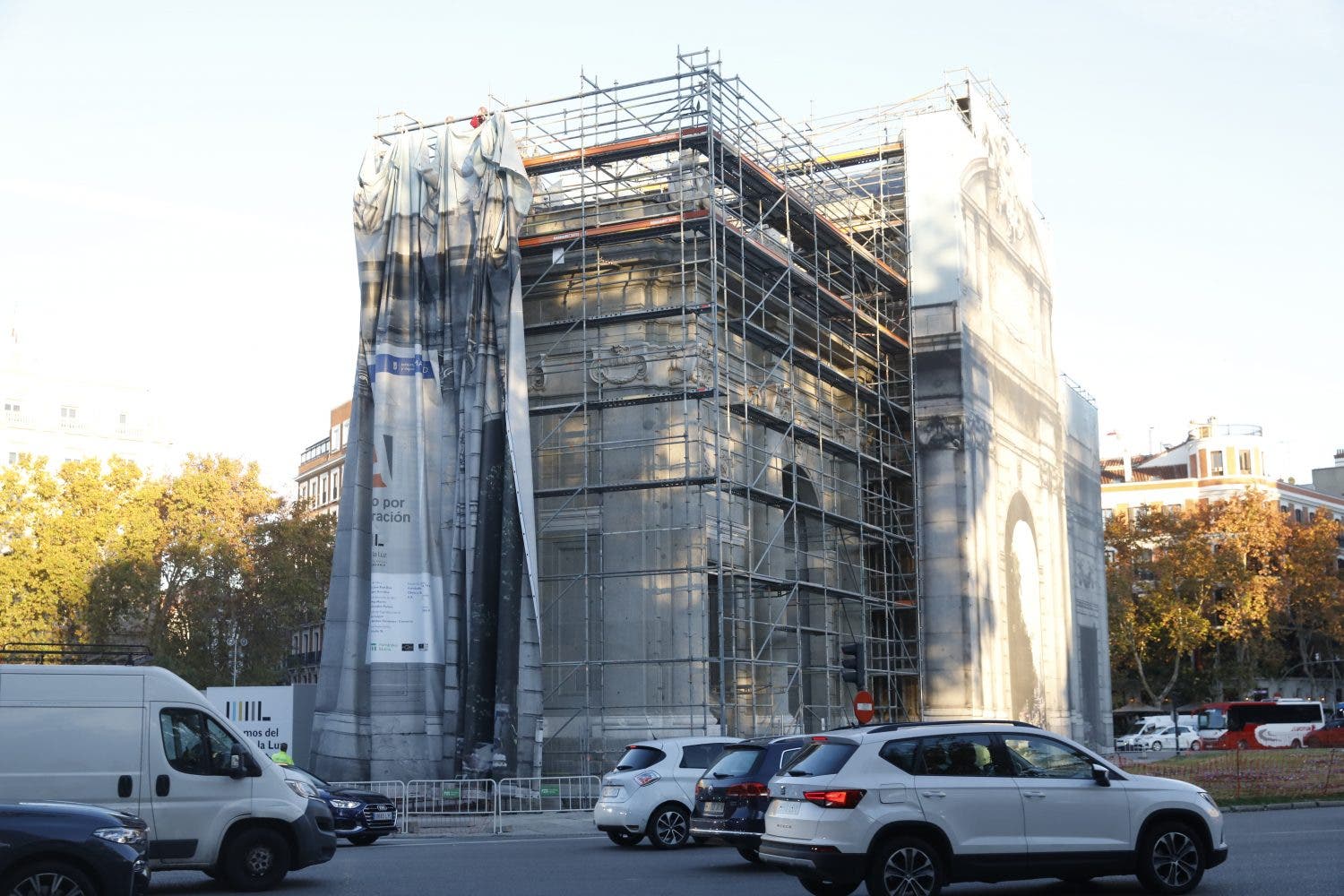 Madrid comienza a retirar la lona y el andamio de la Puerta de Alcalá