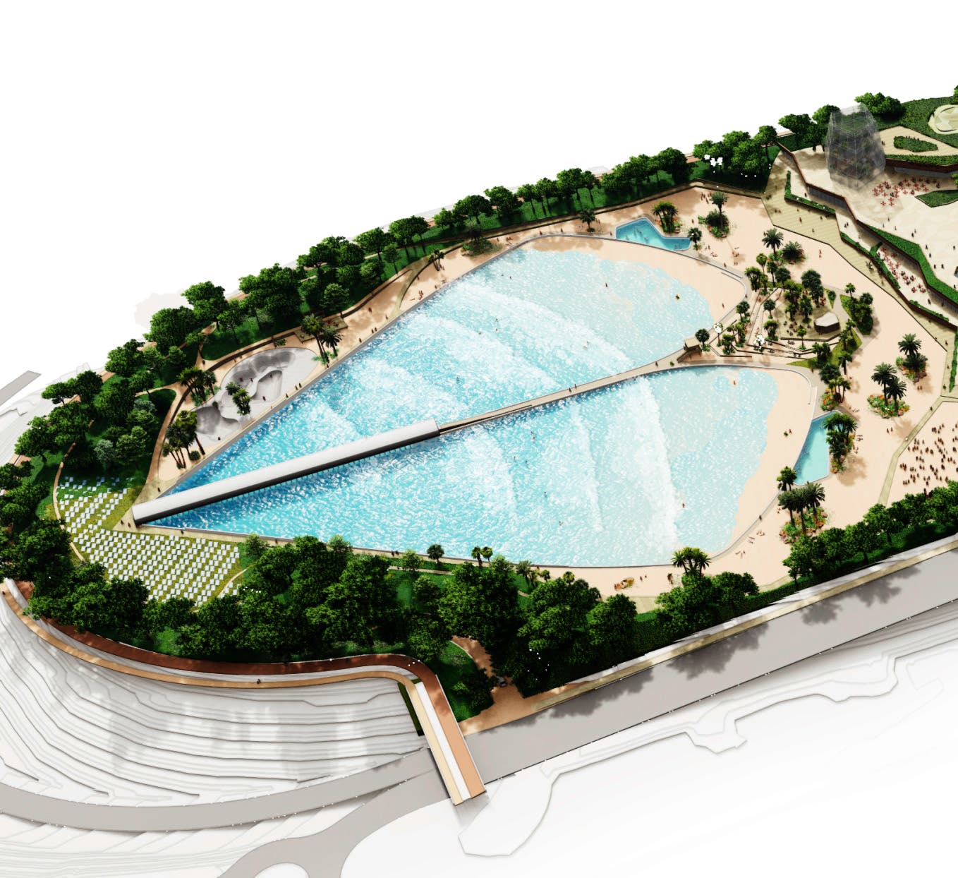 Este nuevo parque de olas se encuadra dentro del desarrollo de la nueva Ciudad del Deporte promovida por el Atlético de Madrid en los terrenos que rodean el estadio Cívitas Metropolitano para el disfrute de todos los madrileños. La previsión es que la playa pueda estar lista en 2025.