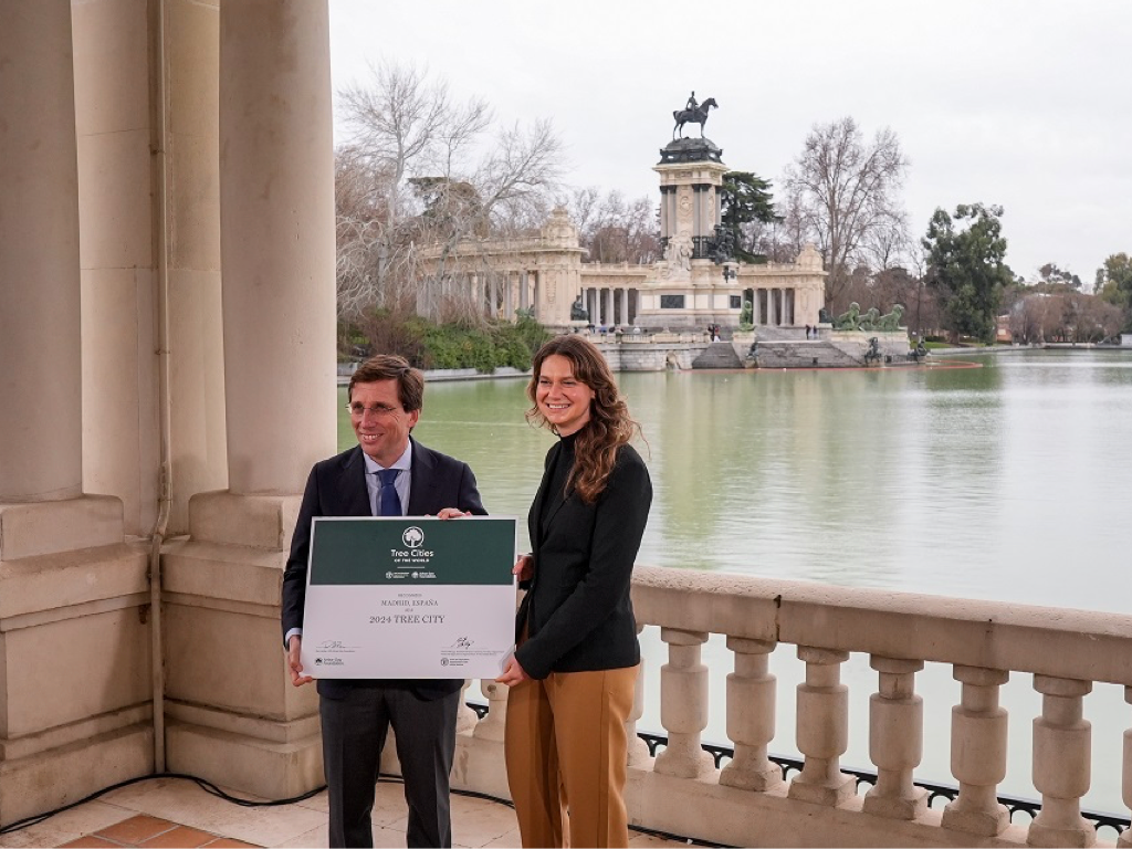Por sexto año consecutivo, Madrid ha sido reconocida como Ciudad Arbórea del Mundo por la Organización de las Naciones Unidas para la Alimentación y la Agricultura (FAO) y la Fundación Arbor Day. Es el único municipio español que ha logrado la distinción en todas las ediciones desde su creación. Así lo ha anunciado este miércoles el alcalde de Madrid, José Luis Martínez-Almeida, en su visita al Parque del Retiro, donde ha recibido esta distinción de manos de la responsable del programa Tree Cities of the World en la Fundación Arbor Day, Sophia Plitt. Como ha señalado Almeida, este prestigioso galardón «es una muestra del compromiso que tiene el Ayuntamiento de Madrid con la buena gestión y conservación del arbolado urbano y las zonas verdes de la ciudad».