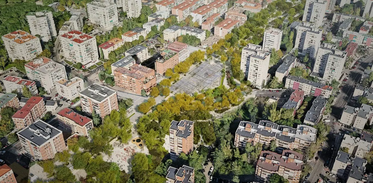 - Enlace del Parque de Atracciones. Con la reforma, quedarán resueltos los fuertes desniveles existentes en un espacio tan concentrado e invitará a la conexión peatonal desde el sur con la Casa de Campo. Integra en la trama urbana el Paseo Verde con el paseo de Extremadura, el viario sobre el túnel de la avenida de Portugal y el acceso sur hacia la Casa de Campo. La mejora del entorno para los vecinos ubicados en el sur de la A-5 será muy trascendente a nivel visual, sonoro y de regeneración del espacio urbano. Se extienden las zonas verdes, generando una lectura continua entre el Paseo Verde y la Casa de Campo en la parte norte de la intervención. Al sur, se define la primera gran plaza, marcada por su proximidad e interacción de usos con el Colegio Divino Maestro y las fachadas comerciales. Tendrá como elemento identitario una gran fuente seca (como la playa de Madrid Río) que garantizará el confort térmico en verano y tendrá también un uso lúdico, lo que reforzará la integración de este espacio público con los equipamientos del entorno.