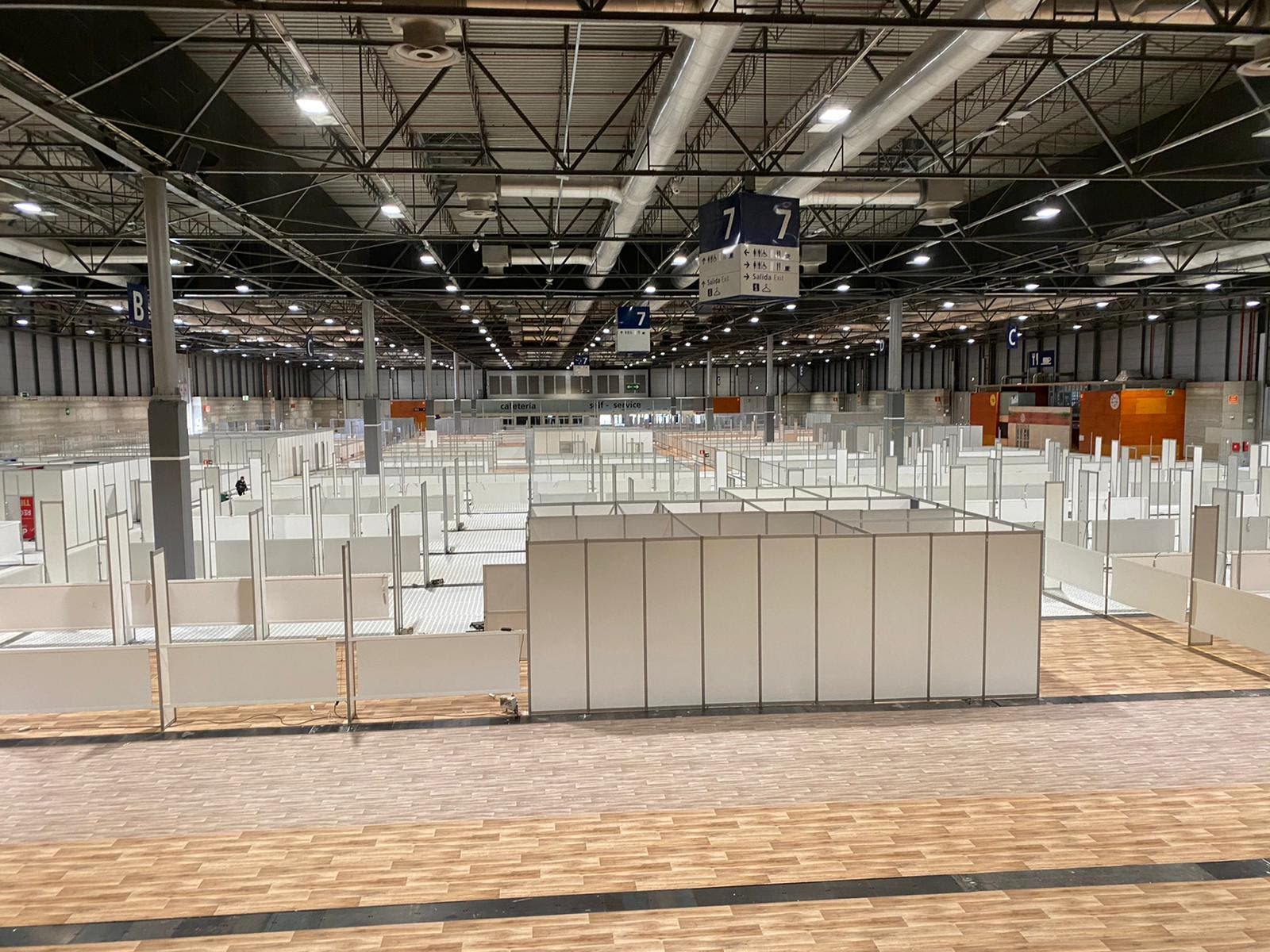 Los montadores de Ifema llevan trabajando desde el pasado viernes por la tarde para poner a punto este nuevo centro. La arquitectura en los pabellones 7 y 9, donde estarán ubicadas las primeras 1.300 camas convencionales más 96 puestos UCI, ya está finalizada y suman cerca de 35.000 metros cuadrados, siendo el espacio más grande el pabellón 9, que alcanza unos 21.000 metros cuadrados.