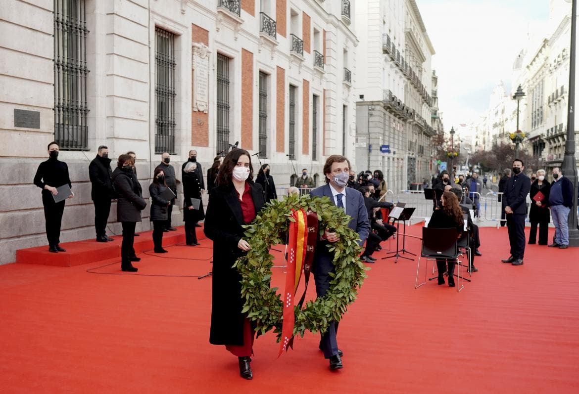 La presidenta de la Comunidad de Madrid, Isabel Díaz Ayuso, y el alcalde de Madrid, José Luis Martínez-Almeida, han depositado hoy una corona de laurel ante la placa en la Real Casa de Correos que recuerda a las víctimas de los atentados del 11 de marzo de 2004, así como a los servicios de emergencias y ciudadanos que las auxiliaron.