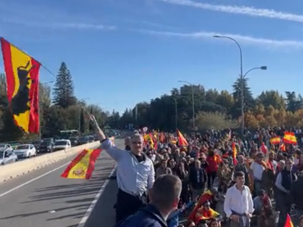 Un grupo de manifestantes contra la amnistía y la investidura de Pedro Sánchez ha cortado este sábado parte de la A-6 tras la masiva concentración de esta mañana en Cibeles.