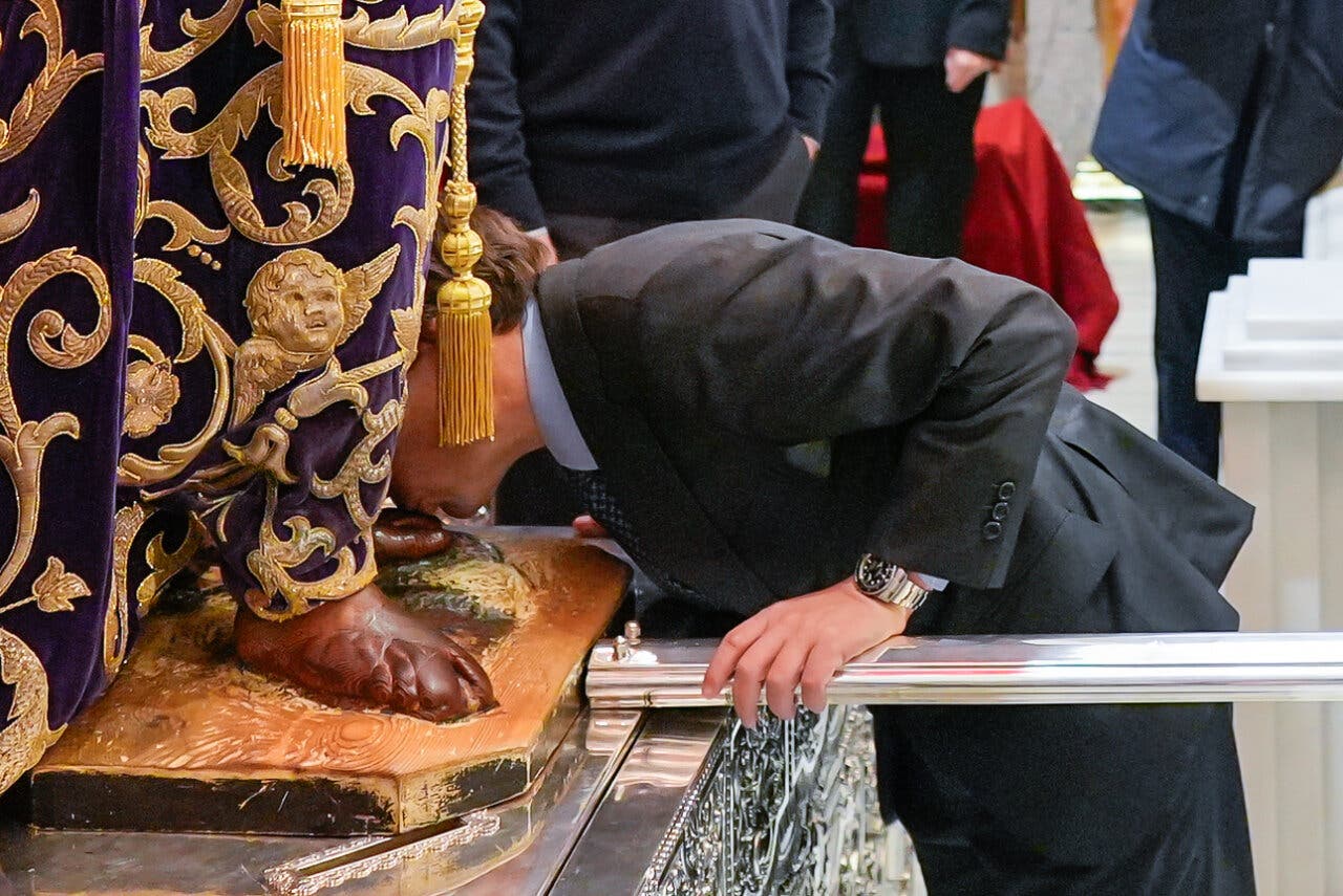 Miles de madrileños y visitantes participan en el tradicional besapiés en la Basílica de Jesús de Medinaceli, que se organiza cada primer viernes de marzo y por el que también ha pasado el rey Felipe VI, quien portaba la medalla de esclavo de honor que la Hermandad le concedió en 2018.