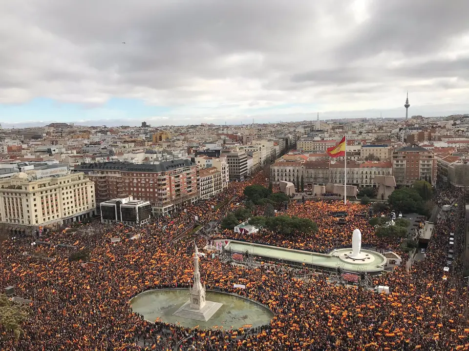 Miles de personas, 200.000 según los organizadores y 45.000 según la Delegación del Gobierno, han acudido este domingo a la Plaza de Colón de Madrid convocados por PP, Ciudadanos y Vox para pedir al presidente del Gobierno, Pedro Sánchez, que convoque elecciones.