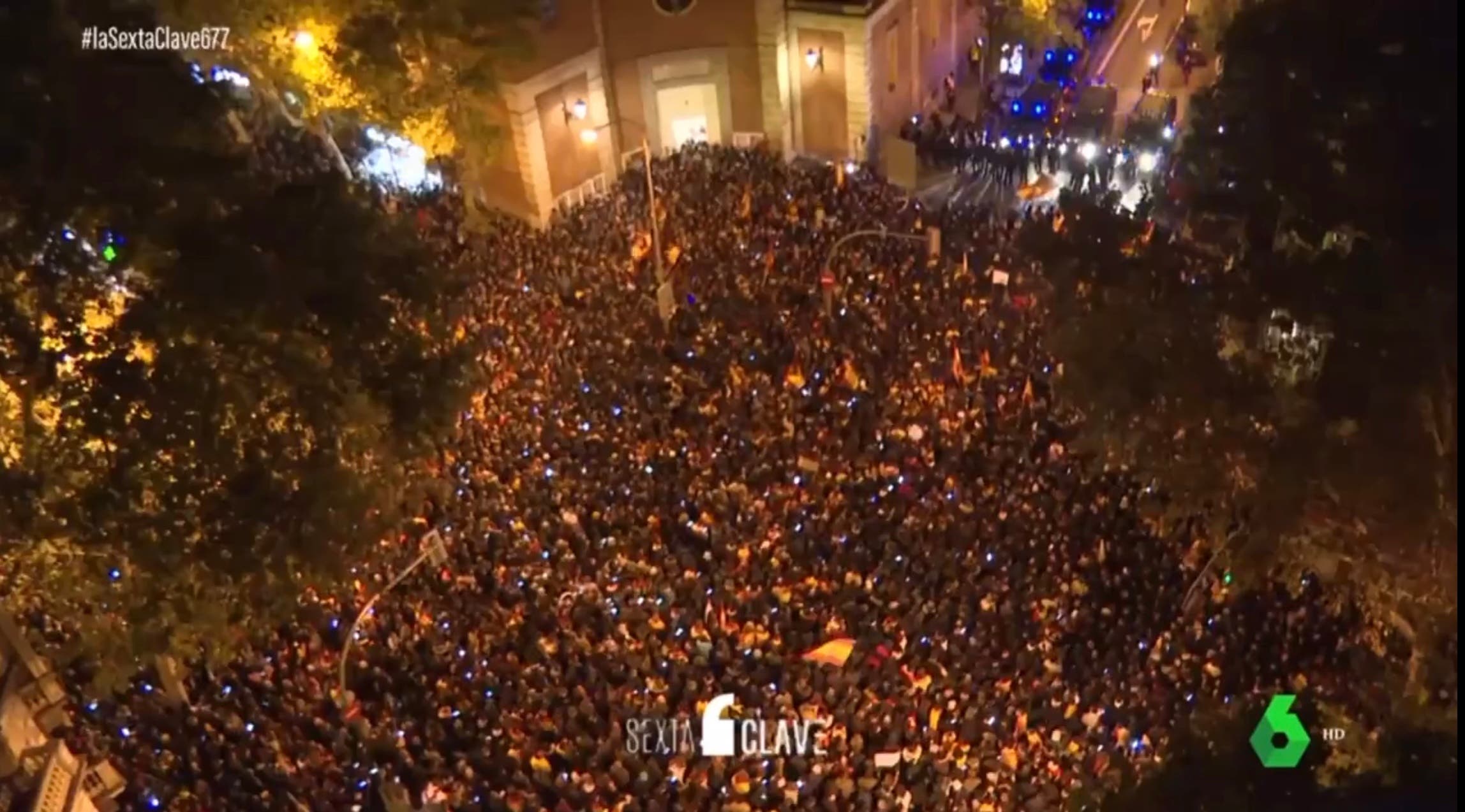Desde las 8 de la tarde, miles de personas se congregaron en torno a la sede del PSOE en Ferraz, en una protesta convocada a través de las redes sociales, y después un grupo numeroso se dirigió hacia la Gran Vía, cortando la calle, para llegar al Congreso de los Diputados, donde protagonizaron una sentada, a pesar del fuerte blindaje policial.