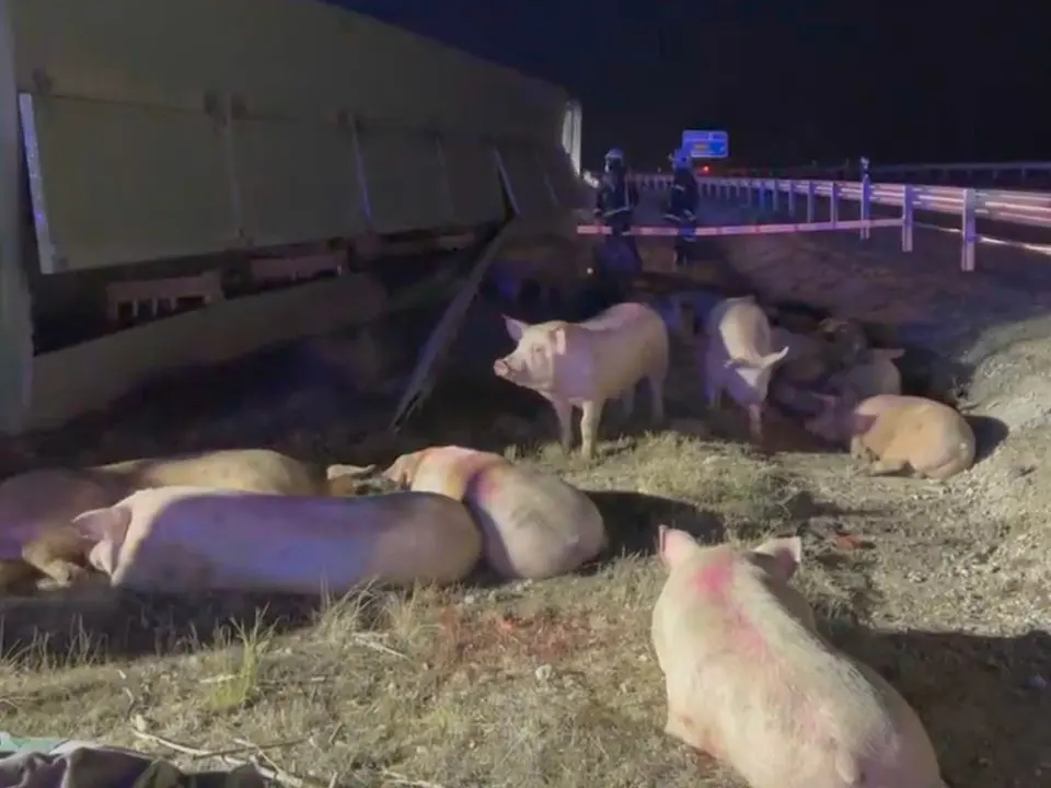 Muere el conductor de un camión que transportaba cerdos al volcar en la A-3