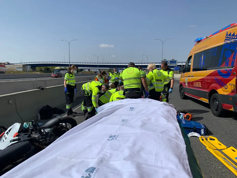 Según ha informado Emergencias Madrid, como consecuencia del impacto y la caída posterior a la vía, el motorista ha sufrido una parada cardiorrespiratoria que han intentado revertir primero testigos y agentes de la Policía Nacional.