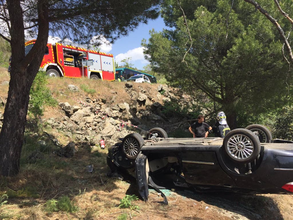 Por causas que ahora investiga la Guardia Civil, el coche ha caído por un terraplén desde una altura de unos 5 ó 6 metros y ha volcado.