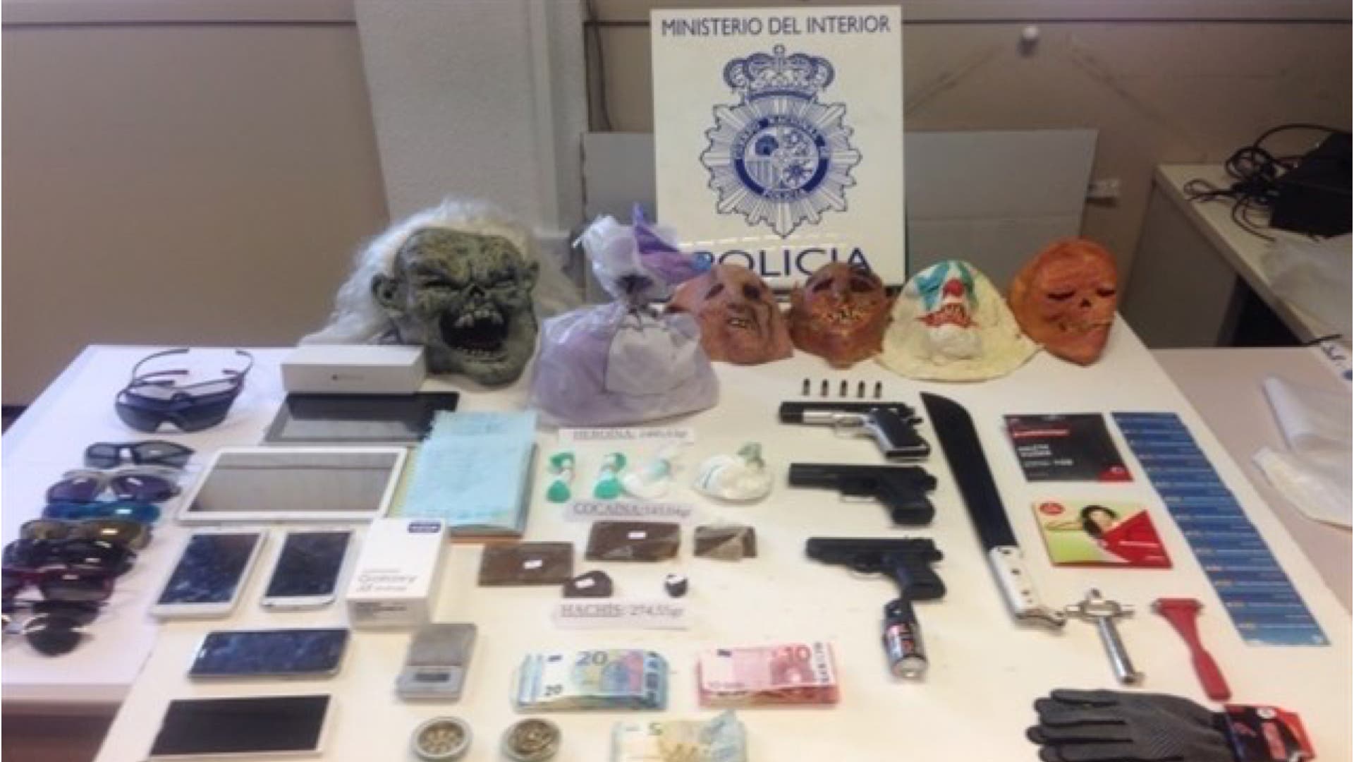 Una vez realizado el registro en el domicilio donde convivían, intervinieron varias armas simuladas, dinero en efectivo, teléfonos móviles y bolsitas que contenían diversas sustancias estupefacientes como cocaína, heroína y hachís.