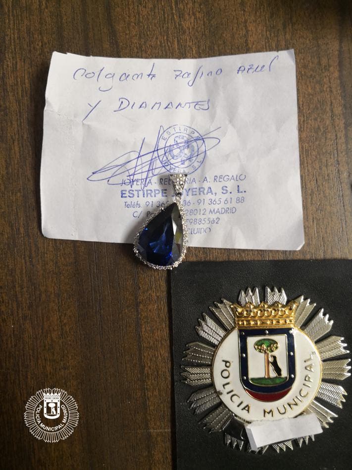 Uno de los agentes se acercó a una joyería cercana, pudiendo verificar la autenticidad de las plumas de plata de ley 925 y la piedra azul como un zafiro natural rodeado de diamantes originales, todo ello con una certificación sellada.