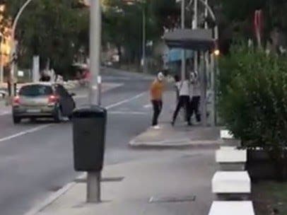 En las imágenes, se puede ver cómo dos jóvenes están sentados en una marquesina esperando el autobús cuando se acercan dos individuos con máscaras blancas.