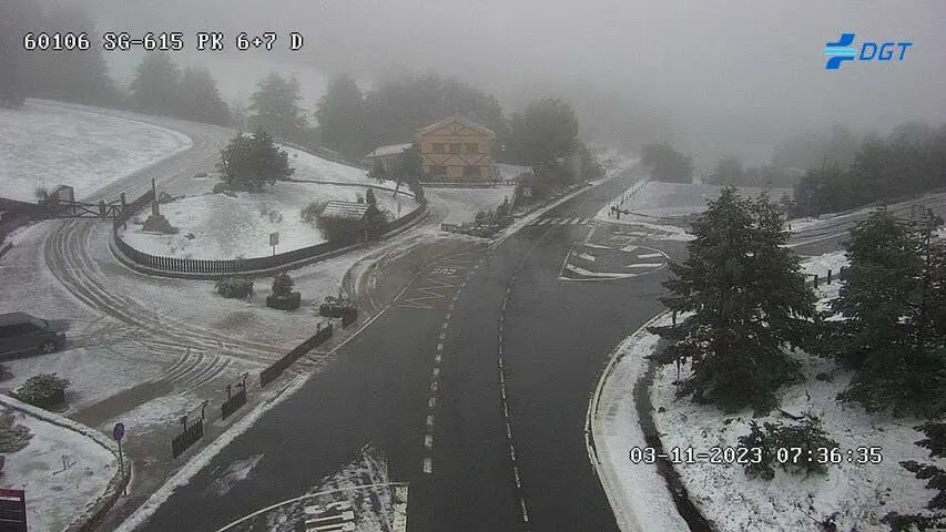 Un manto blanco cubre el Puerto de Cotos, en Rascafría, como han captado este viernes las cámaras de la DGT.