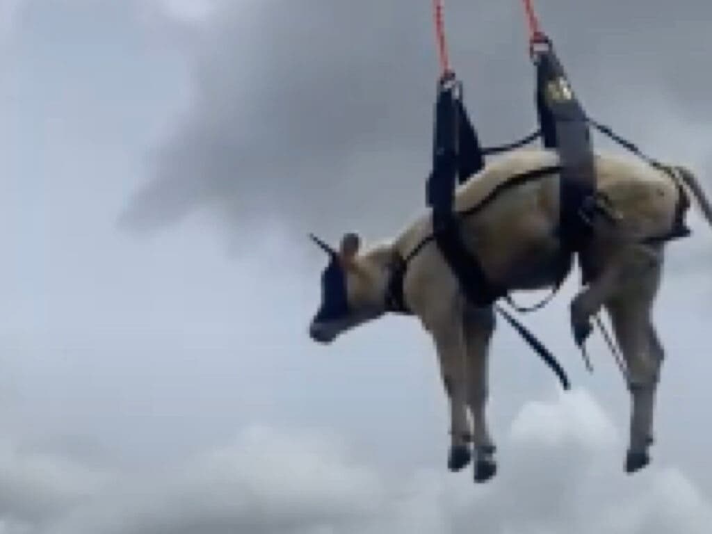 Tras colocar unos arneses especiales para animales, fue extraída de la zona con el helicóptero del GERA y trasladada a su ganadería.