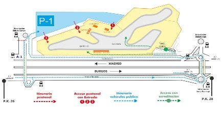 Para acceder a dicho aparcamiento, situado en el circuito, los vehículos procedentes de Madrid circulen por la A-1 podrán utilizar los cambios de sentido existentes en los kilómetros 26 (por vía de servicio) y 28 (San Agustín del Guadalix) de dicha carretera. También se podrá llegar a este estacionamiento utilizando la M-607, desde Madrid a Colmenar Viejo, M-104 a San Agustín del Guadalix y A-1 al circuito. El estacionamiento estará prohibido en arcenes y otras zonas no habilitadas.