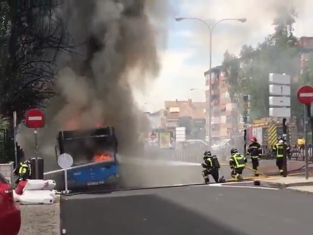 Un autobús de la Empresa Municipal de Transportes (EMT) sin pasajeros ha salido ardiendo este lunes en Madrid, como se puede ver en las imágenes publicadas por varios usuarios en las redes sociales.