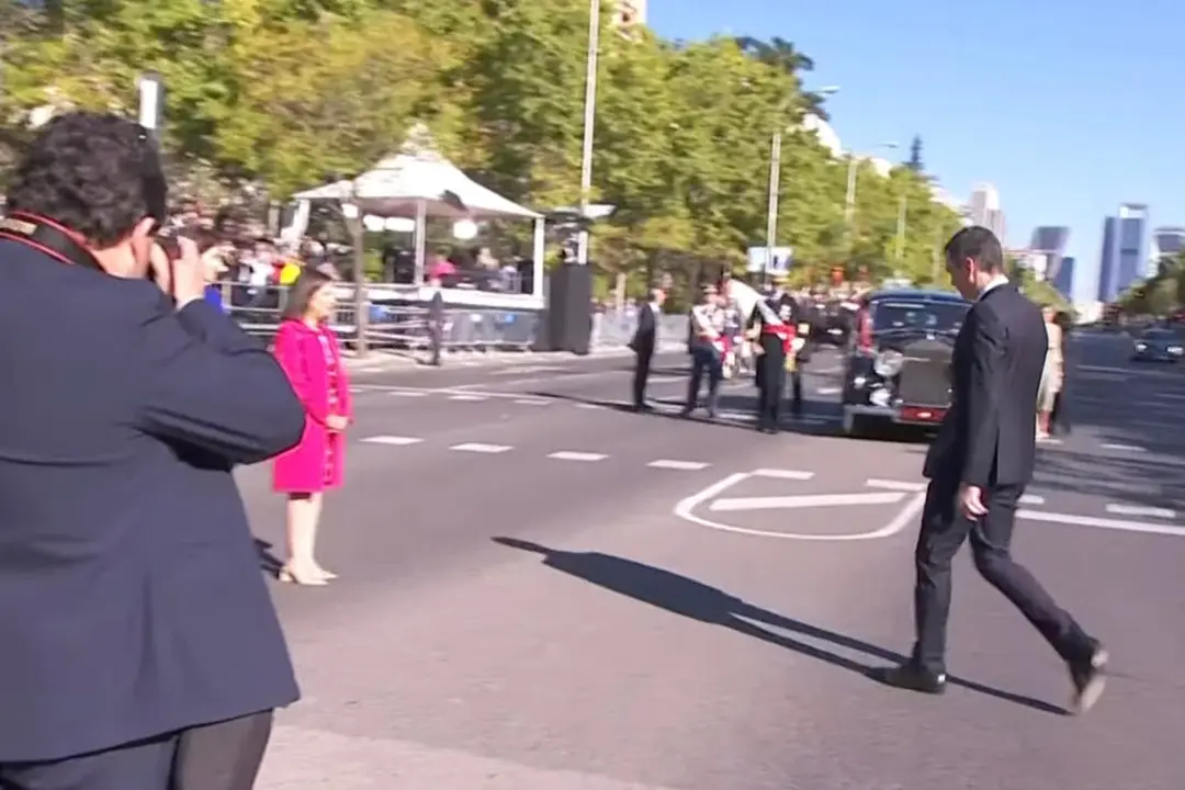 El presidente del Gobierno, Pedro Sánchez, se ha saltado este miércoles, 12 de octubre, el protocolo del desfile militar por el Día de la Fiesta Nacional que se ha celebrado, como es tradición, en el Paseo de la Castellana de Madrid, retrasando con ello el inicio del acto.