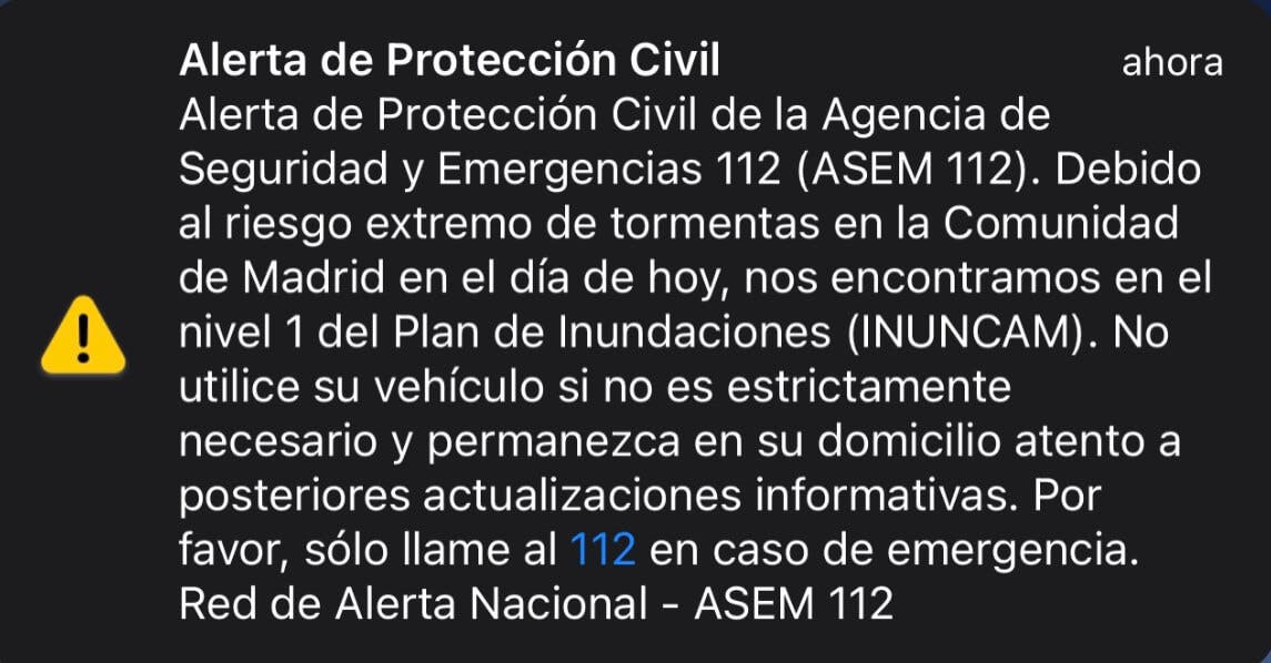 «Alerta de Protección Civil de la Agencia de Seguridad y Emergencias 112 (ASEM 112). Debido al riesgo extremo de tormentas en la Comunidad de Madrid en el día de hoy, nos encontramos en el nivel 1 del Plan de Inundaciones (INUNCAM). No utilice su vehículo si no es estrictamente necesario y permanezca en su domicilio atento a posteriores actualizaciones informativas. Por favor, sólo llame al 112 en caso de emergencia», indica el mensaje que han recibido millones de ciudadanos.