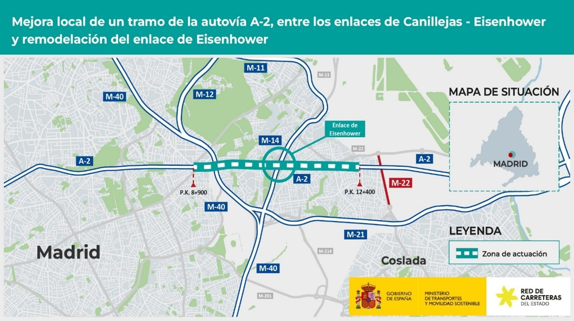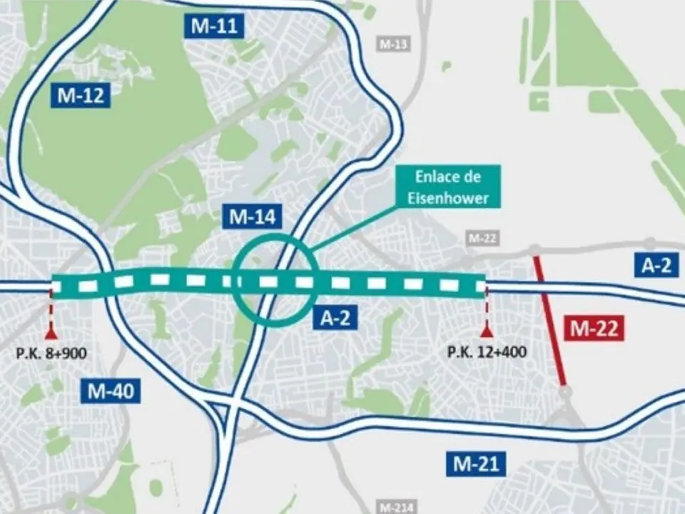 Asimismo, se llevará a cabo la remodelación del enlace Eisenhower, mediante la reconstrucción de los dos pasos inferiores existentes, la mejora del trazado y la ejecución de dos nuevos ramales de conexión de la A-2 con la M-14.