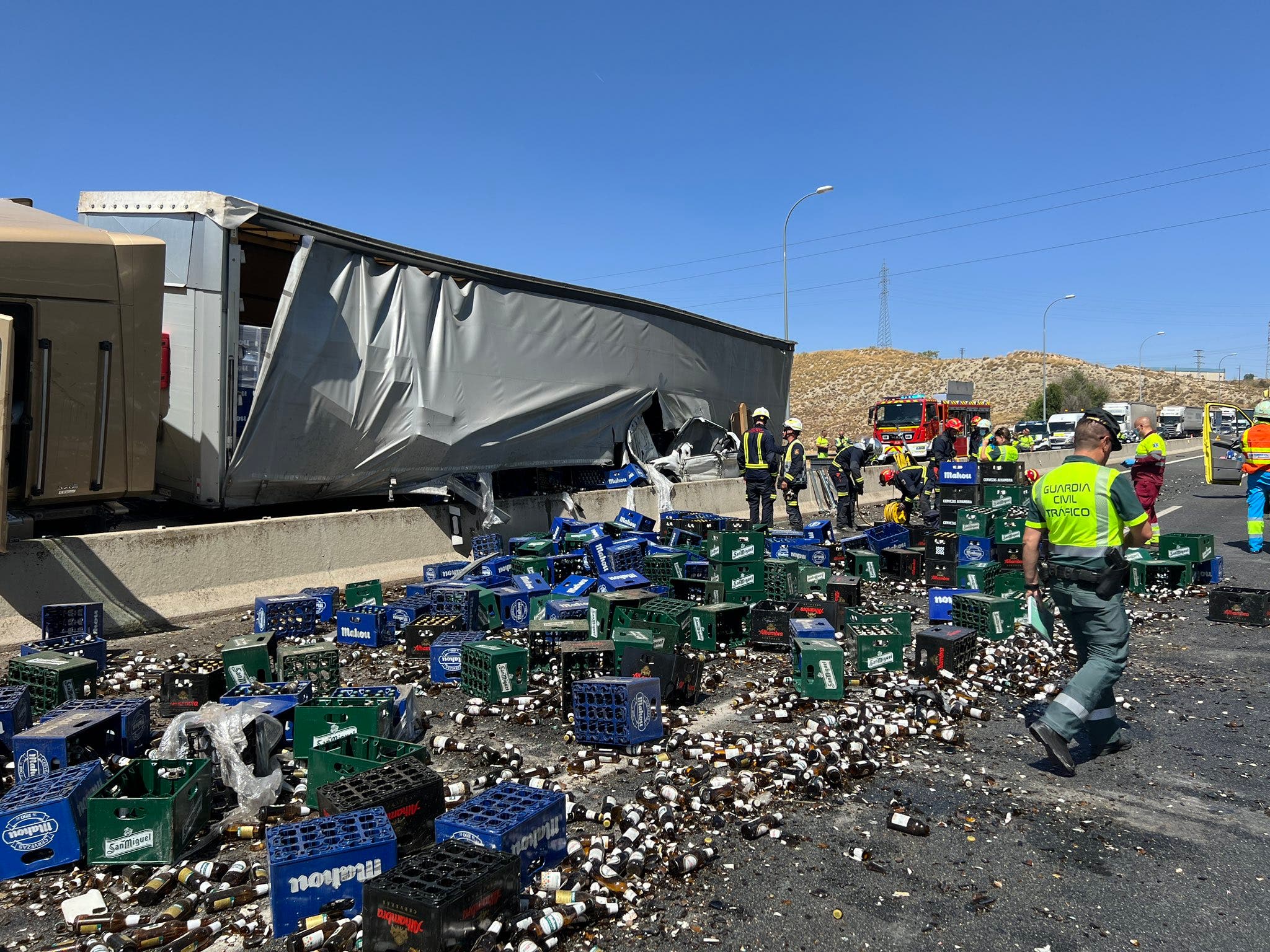Un accidente en la A-4 deja un herido grave y cervezas esparcidas por la carretera