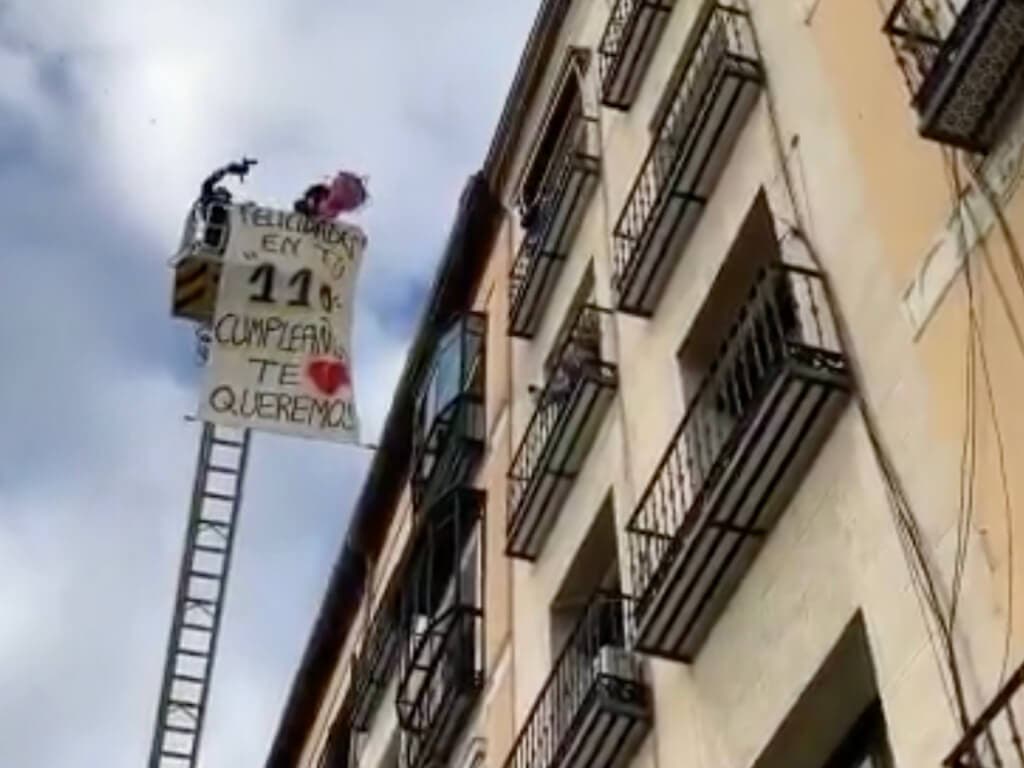 Treparon por la fachada con ayuda de la escala para felicitarle el cumpleaños porque su nieto, Julián, es bombero y quería hacerlo de manera especial, desde la ventana. Un momento muy emocionante y más en estos tiempos, como explica en el siguiente vídeo.