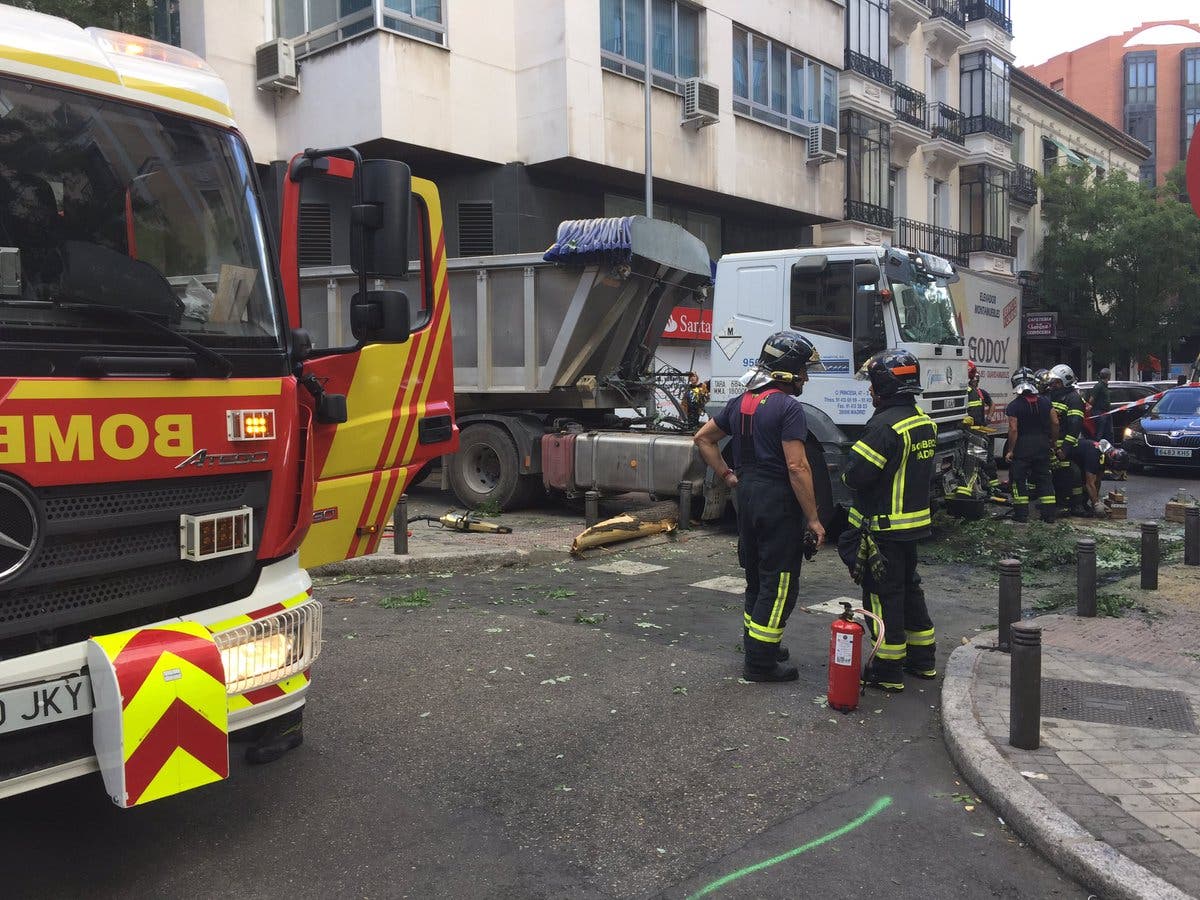 Un camión que se encontraba aparcado ha perdido los frenos y se ha subido en la acera, provocando la caída de un árbol, un semáforo y varios bolardos hasta que ha colisionado contra otro camión, también estacionado, según ha informado Emergencias Madrid.