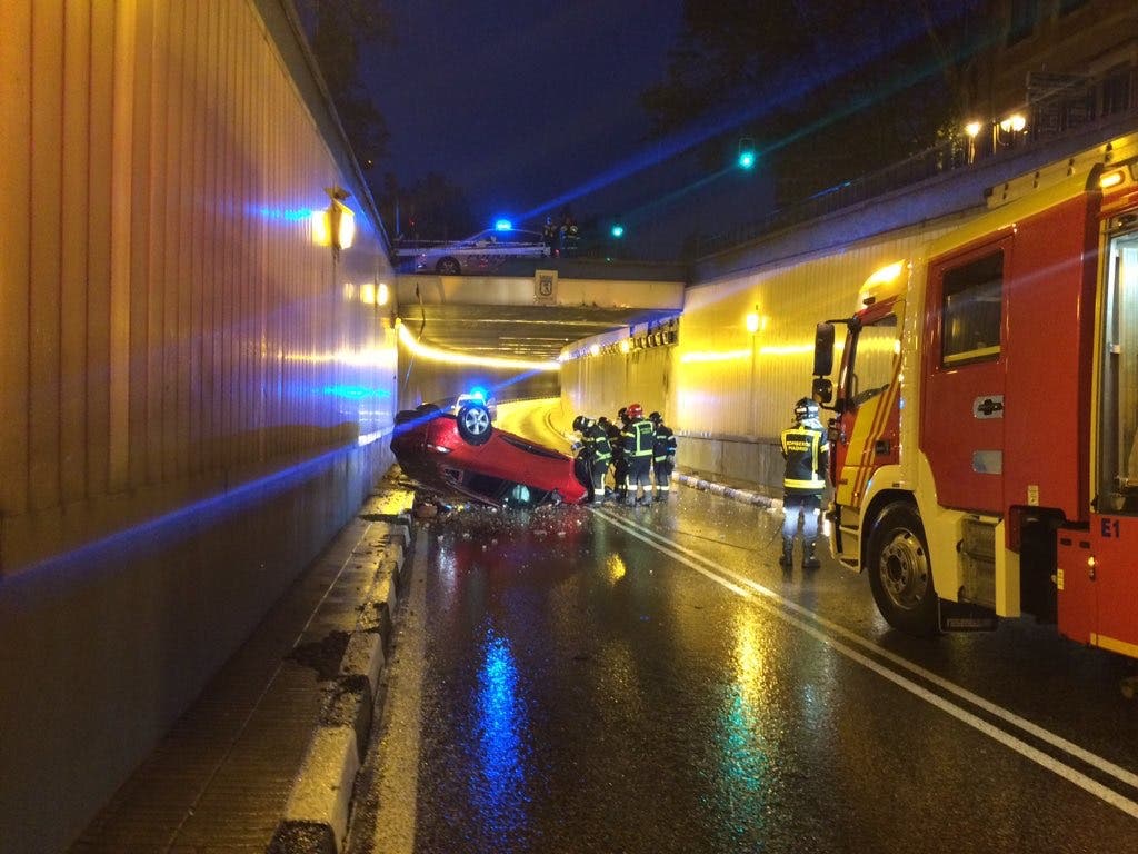 Un coche cayó en la madrugada del domingo desde unos cuatro metros de altura al interior del túnel de Infanta Cristina, en Atocha, y cuando los servicios de urgencias acudieron al accidente no encontraron ocupantes dentro, segú informan fuentes de Emergencias de la Comunidad de Madrid.