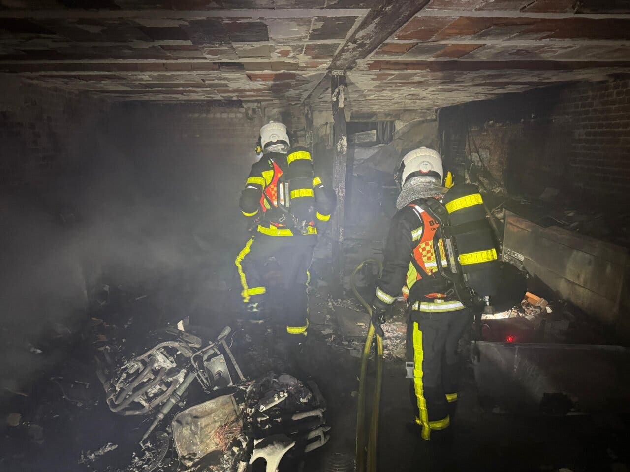 Los bomberos de la Comunidad de Madrid han encontrado un garaje de 80 metros cuadrados completamente en llamas, con dos motos y varios enseres ardiendo en su totalidad. Las ocho dotaciones desplazadas han trabajado para confinar el incendio y evitar su propagación a las plantas superiores y a viviendas aledañas.