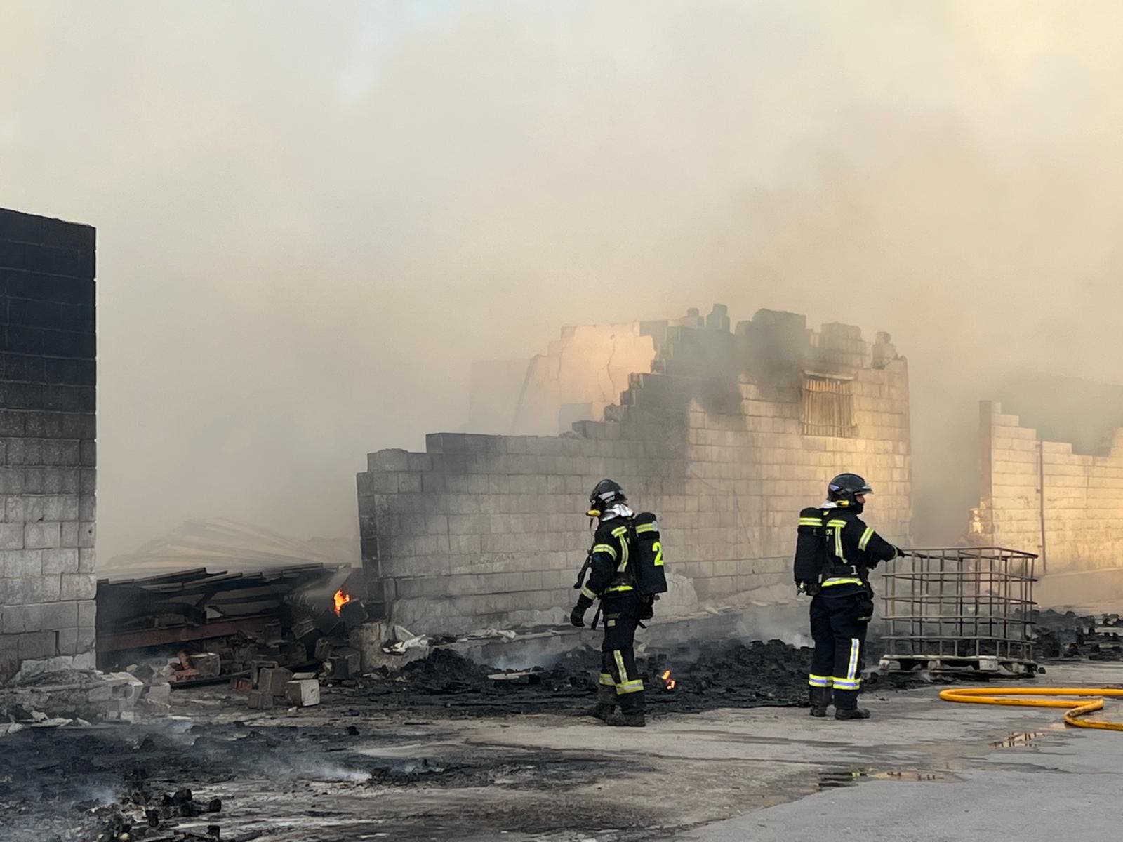 A la llegada de los Bomberos se encontraban ya muy desarrolladas y como consecuencia de la virulencia del fuego, la cubierta de la nave se ha venido abajo. El fuego ha sido rápidamente controlado por los Bomberos evitando que se extendiera a otras parcelas.