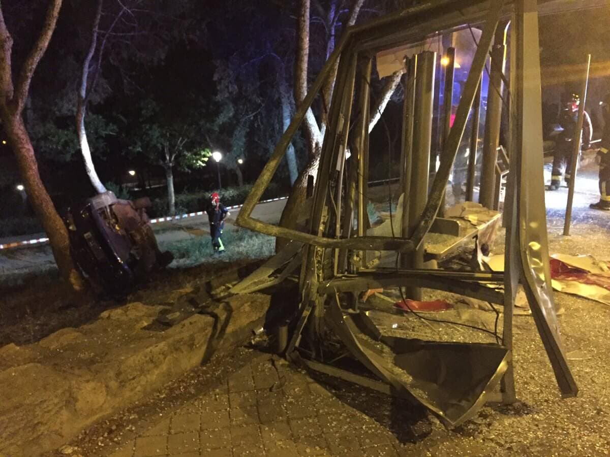 Los Bomberos del Ayuntamiento de Madrid han retirado el coche que ha quedado volcado en un terraplén de zona arbolada, mientras que la marquesina, como se puede ver en las fotos, ha quedado completamente destrozada.