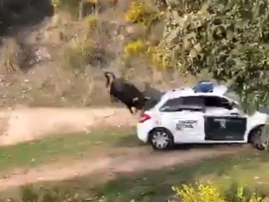 El animal llegó a embestir contra tres coches de la Guardia Civil, como se puede ver en el vídeo difundido en Twitter por la Asociación Asociación Unificada de Guardias Civiles (AUGC), en el que el toro se ceba con uno de los vehículos.
