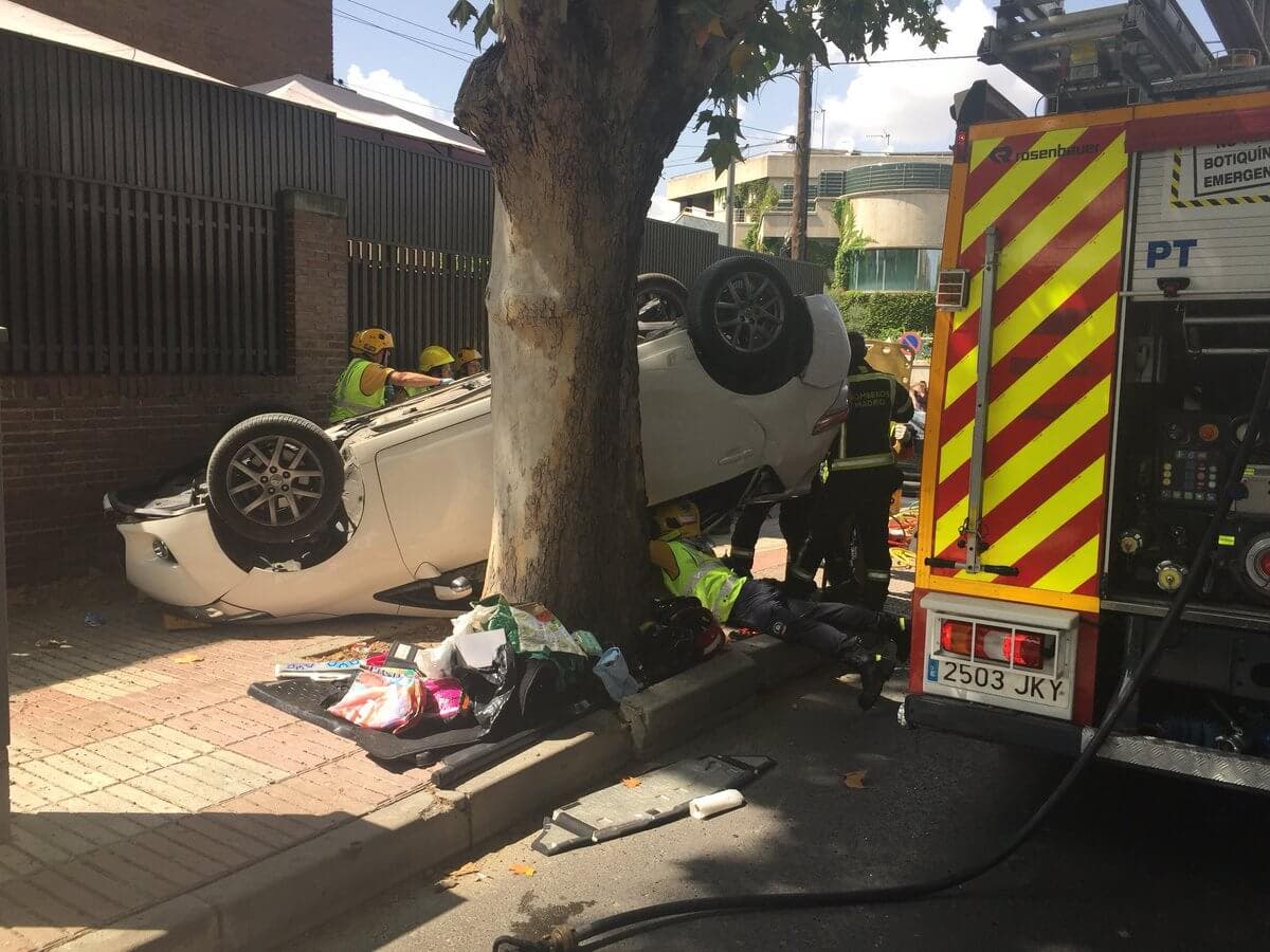 Los Bomberos tuvieron que rescatar a la conductora del vehículo accidentado, que sólo sufrió una fractura en la mano y en el antebrazo izquierdos, y fue trasladada en estado menos grave al Hospital Ramón y Cajal.