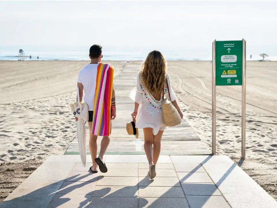 No hay prisa. Es verano y la playa Nord de Gandia es una especie de imán que lleva al turista a querer pasar una jornada de sol y playa. Conviene no precipitarse y mirar aquella pasarela que es de entrada pues se han señalizado para facilitar la distancia social. Luego, buscar aquel hueco que tenga una distancia prudencial con el resto de bañistas para garantizar el bienestar de todos.