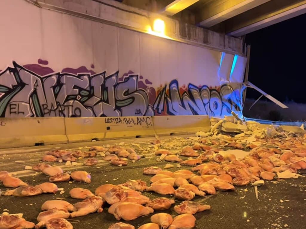 Vuelca un camión con 30 toneladas de jamones en el enlace de la R-4 con la M-50