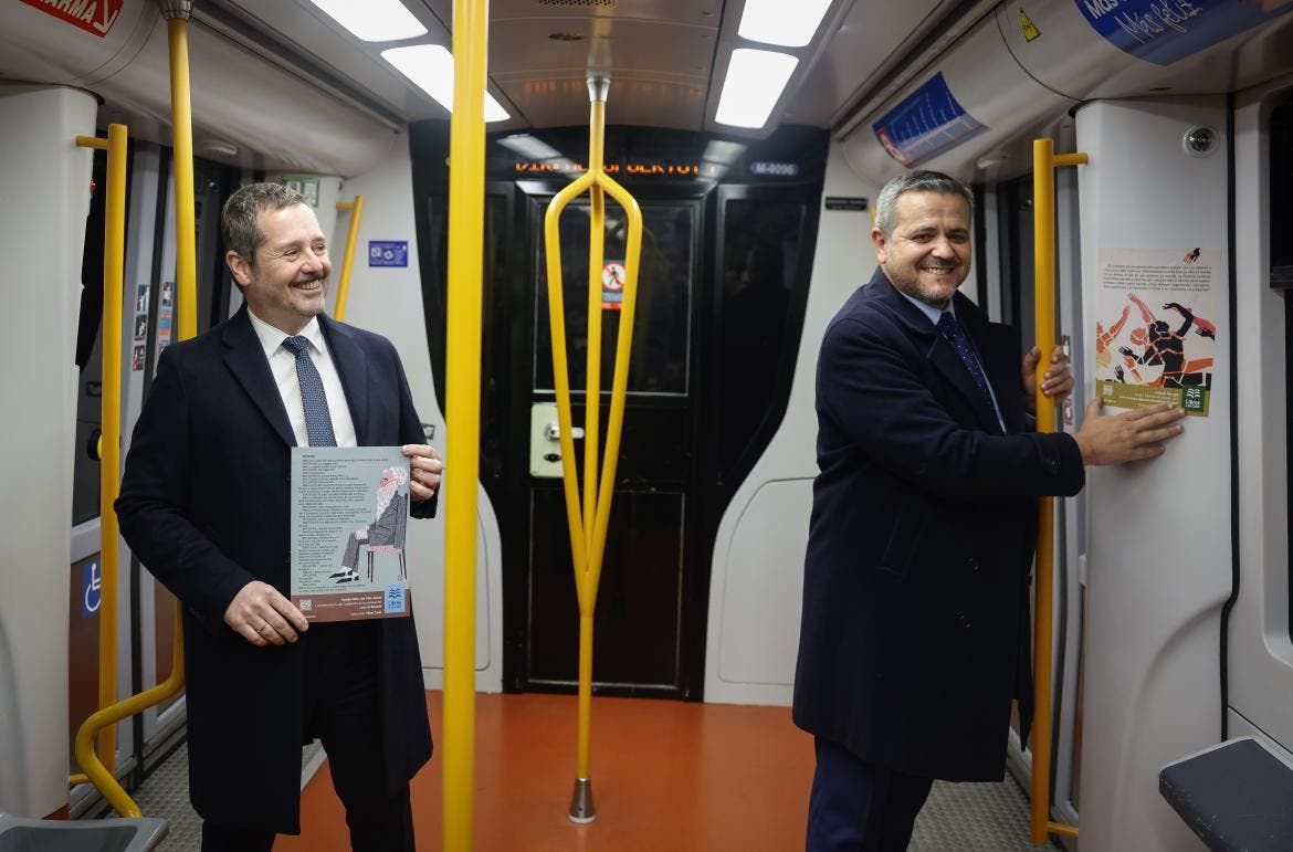 Los consejeros de Vivienda, Transportes e Infraestructuras, Jorge Rodrigo, y de Cultura, Turismo y Deporte, Mariano de Paco Serrano, han realizado hoy un recorrido en la Línea 8 del suburbano, desde la estación de Nuevos Ministerios hasta Feria de Madrid, donde han colocado una de estas láminas que plasman pequeñas píldoras de textos de renombrados escritores. «Se trata de una iniciativa que ya se ha convertido en tradición y que representa una reivindicación de la lectura como elemento constructivo de una sociedad con ciudadanos más formados, dialogantes, con sentido crítico y esencialmente libres», ha destacado Rodrigo.
