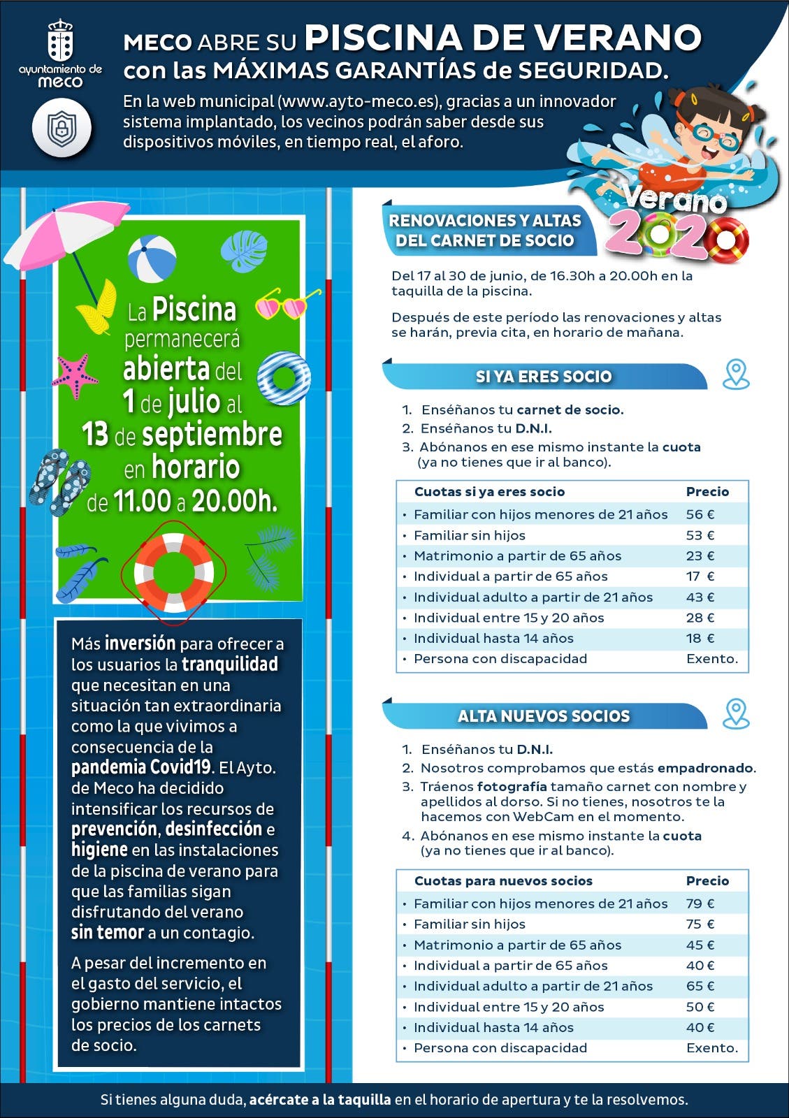 El Ayuntamiento de Meco ha anunciado que sí abrirá su piscina de verano y lo hará con un innovador sistema para controlar en todo momento el aforo y «con las máximas medidas de seguridad» para evitar contagios de Covid-19. A través de la web municipal, los vecinos podrán saber desde sus dispositivos móviles, en tiempo real, el aforo de la piscina.