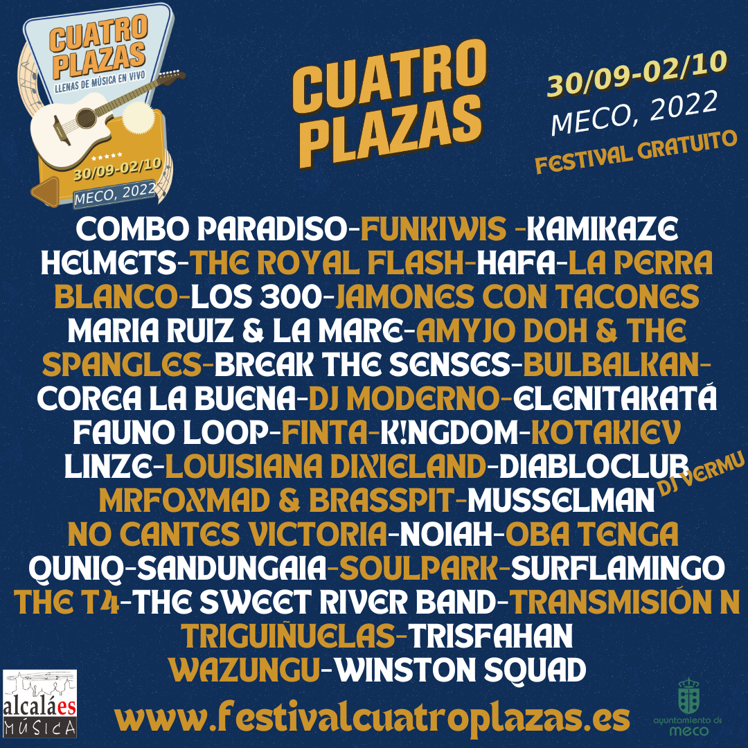El Festival Cuatro Plazas de Meco presenta su cartel definitivo que une grupos consagrados, bandas emergentes y locales, con 37 propuestas gratuitas por los escenarios y calles de la ciudad, de todos los estilos musicales, en un festival organizado por el Ayuntamiento de Meco con la colaboración y producción de la asociación Alcalá es Música.