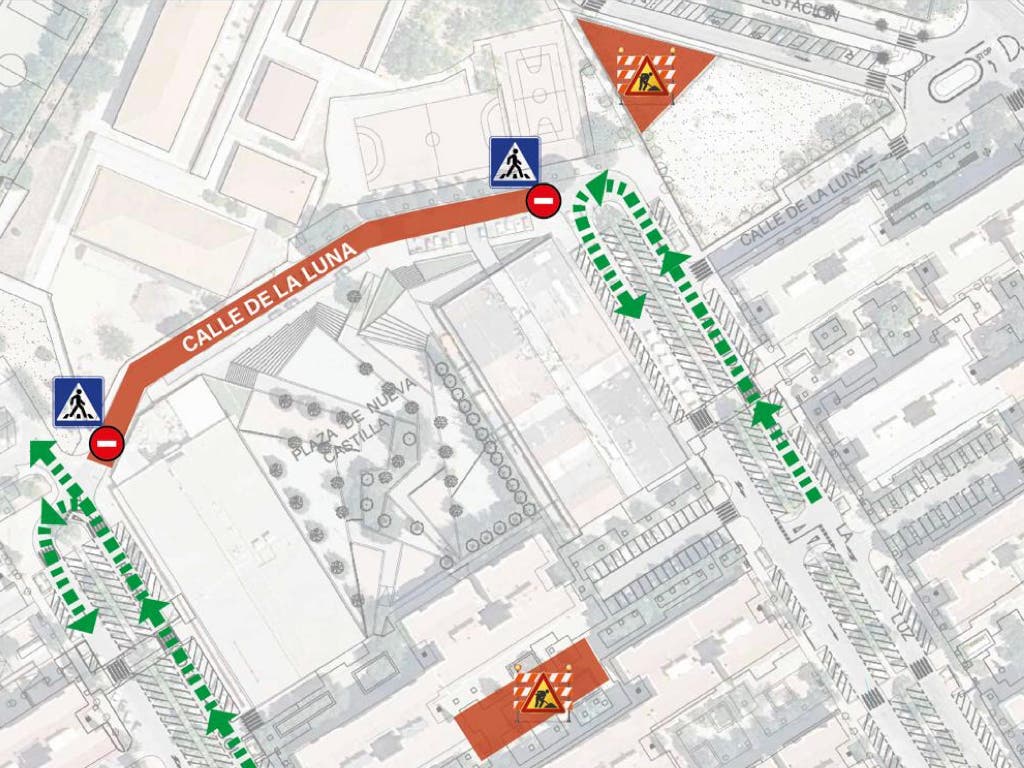 Además del corte de tráfico, los trabajos se extenderán a otras zonas del barrio en estos primeros días. La trasera del bloque de la Plaza Nueva Castilla se convertirá en una nueva zona de aparcamiento y vía de conexión entre la Avenida de la Luz y el Paseo del Sol.