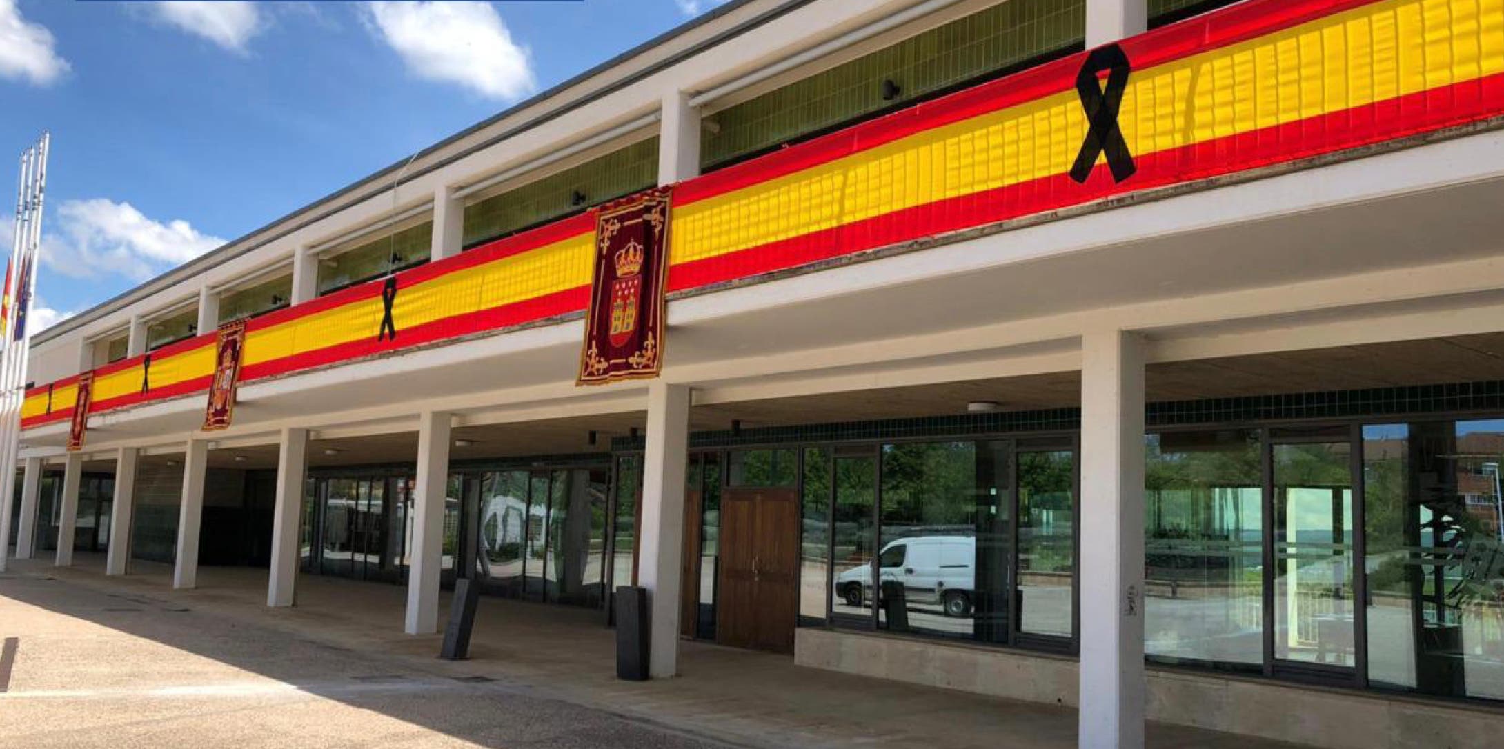 Crespones negros cosidos por manos solidarias para honrar a las víctimas que el coronavirus está dejando en Meco. Desde este viernes, el balcón de la Casa Consistorial se viste de luto con la bandera de España como protagonista principal.