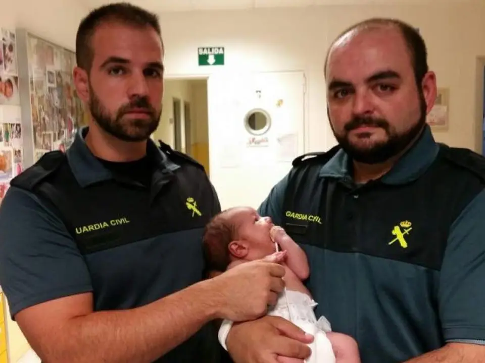 Imagen portada: Los dos agentes de la Guardia Civil junto al bebé que encontraron en la basura. Fuente: Archivo.