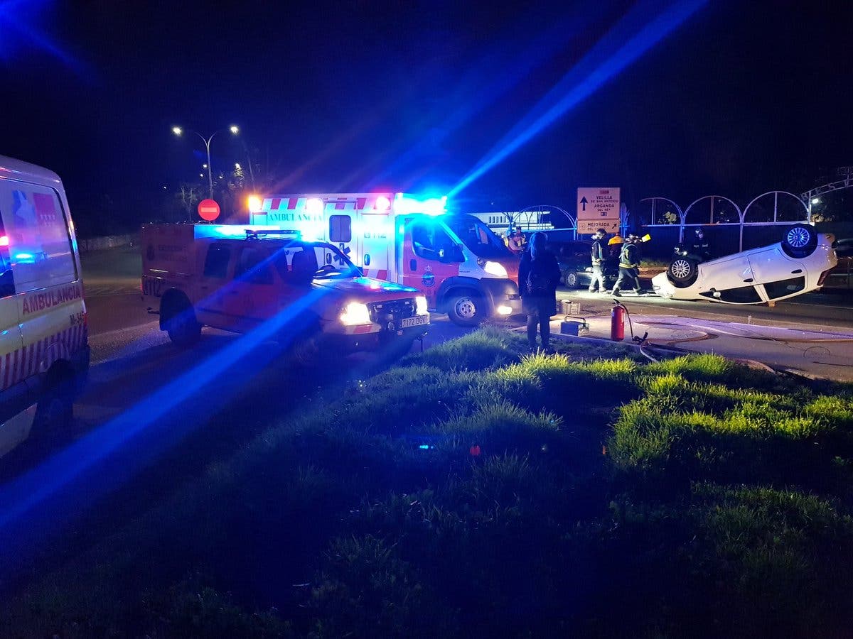 La conductora del vehículo volcado sufrió heridas leves y fue trasladada al Hospital de Arganda del Rey.