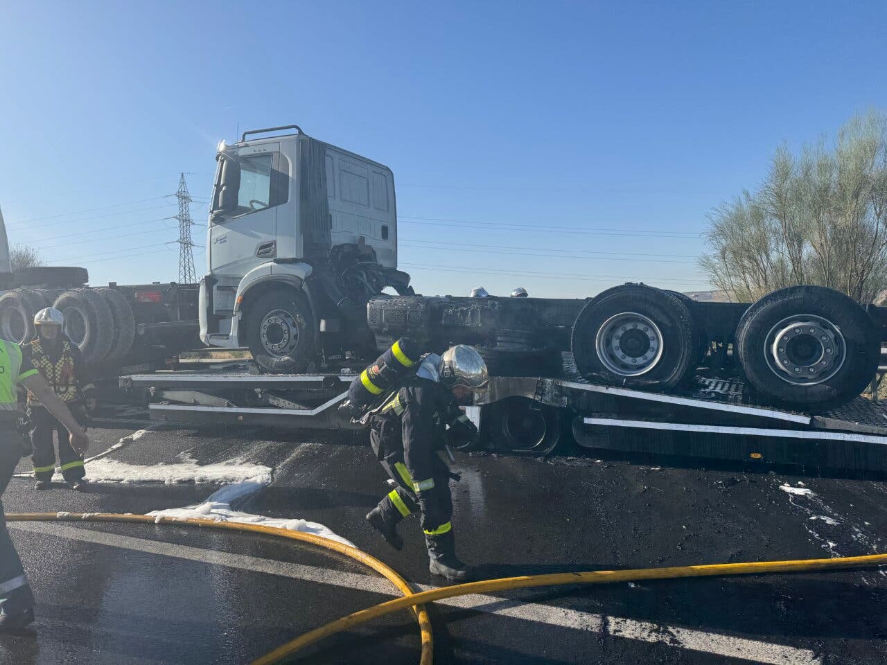 Un camión ha ardido este jueves por la mañana en el kilómetro 12,200 de la R-3, a la altura de Mejorada del Campo. El suceso ha obligado a cortar la vía mientras trabajaban los equipos de emergencia. Cuatro dotaciones de Bomberos de la Comunidad de Madrid han sofocado el fuego. No se han registrado heridos.