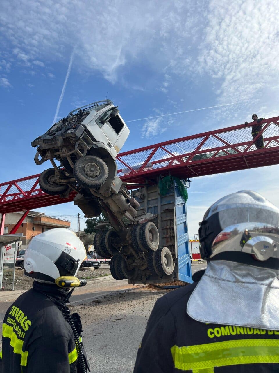 Un camión ha quedado encajado en un puente peatonal en Mejorada del Campo este jueves por la tarde y su conductor ha tenido que ser rescatado por los Bomberos de la Comunidad de Madrid al quedar la cabina empinada.