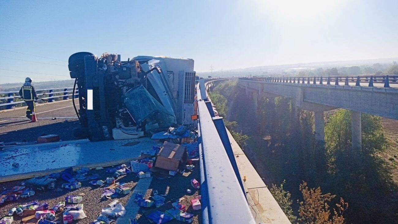 Como consecuencia del impacto, el camión ha esparcido la carga sobre la calzada, al parecer envases de plástico, y ha quedado volcado lateralmente junto a un puente.