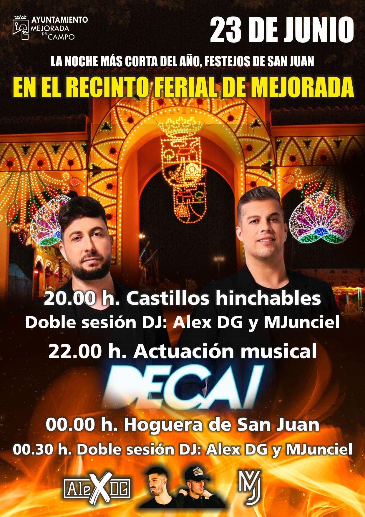 Antes del concierto, a partir de la 20:00 horas, los más pequeños podrán disfrutar del parque de castillos hinchables gratuitos instalados para la ocasión y los jóvenes con la doble sesión DJ con Alex D.G. y MJunciel que volverán a actuar otra vez a las 00:30 tras la hoguera.