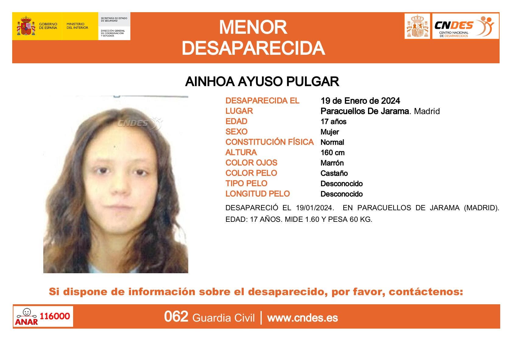 Se trata de Ainhoa Ayuso Pulgar, de 17 años, 1.60 de estatura, 60 kilos de peso. La joven tiene los ojos marrones y el pelo castaño, según la alerta difundida por el Centro Nacional de Desaparecidos.